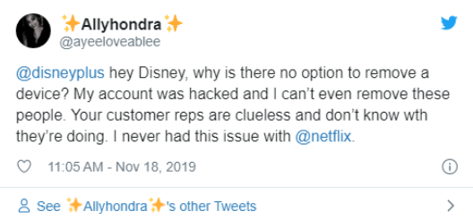 Unfortunately, it’s not really feasible to enforce unique passwords from your entire customer base, but it should always be encouraged. The real problem is the lack of additional security for a person’s account. Disney+ doesn’t offer 2-factor authentication at this time. The service also makes it difficult to remove unwanted devices that have connected due to a breached password.