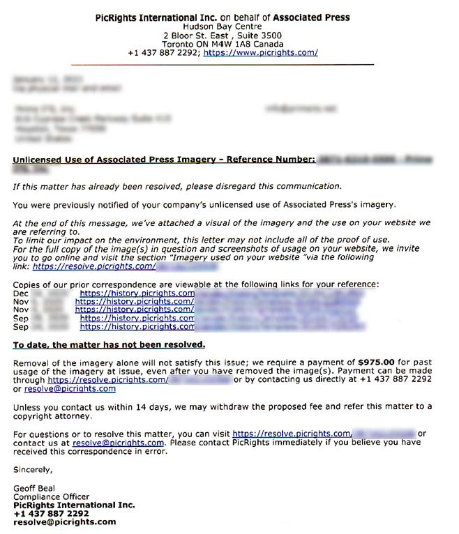 In our experience, once a recipient responds to the extortion email to prove they have a pulse, PicRights/Higbee and Associates springs into action and starts sending out physical mail as well, and really start to escalate to get you to pay thousands of dollars for an image that they might not even represent, may have been obtained legally, or might be covered under fair use.