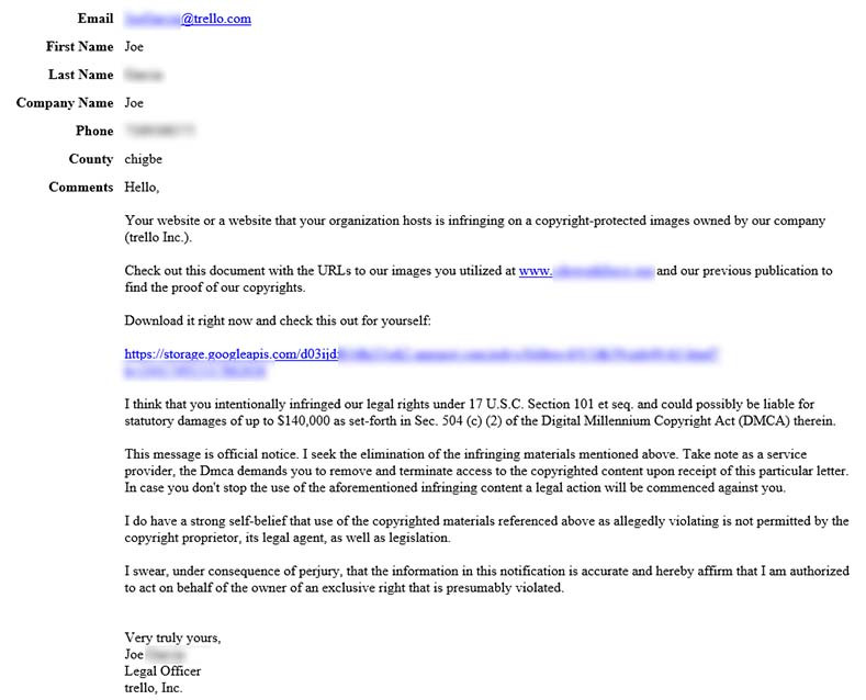 A copyright infringement scam involves a third-party, claiming to be a law firm or lawyer representing the copyright owner of an image you are using on your website. They send you emails or reach out to you from a contact form on your website stating that you have violated copyright law by unauthorized use of an image that doesn’t belong to you. They usually give you a few pages of legal mumbo jumbo, including terms that usually more or less say that removing the image now doesn’t solve the issue, that you owe for damages just for using the image, etc. Finally, they let you know that you can conveniently settle outside of court if you quickly hand over a large sum of money (as if it’s some huge favor to you).