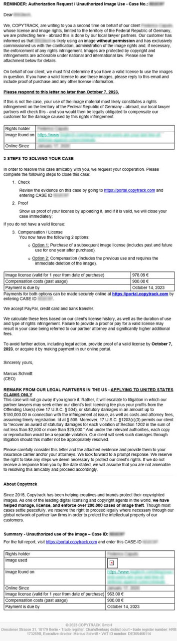 Based on a little investigation, Copytrack is located in Germany (Berlin, to be precise). That doesn’t make them less legitimate as a business, but what they are doing certainly throws up some red flags. Their Google reviews are full of people claiming that Copytrack made false claims of copyright infringement. Copytrack doesn’t claim to be a law firm, but does claim they are protecting the rights of photographers, even if those photographers aren’t actually clients of Copytrack. They use image-matching AI and web crawling tools to look for potential misuse, and then send scary correspondence to get you to pay them.
