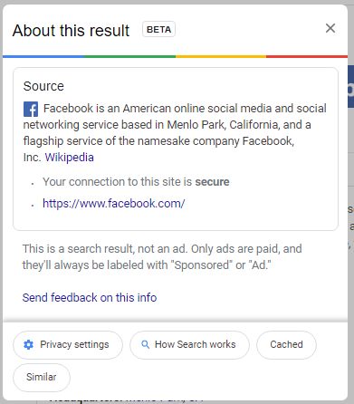 This information will include things like a blurb about the website the link directs to—if available, coming from Wikipedia, and if not, based on Google’s own analysis when the site was indexed—as well as whether the website offers a secure HTTPS protocol connection and if a link is an ad.