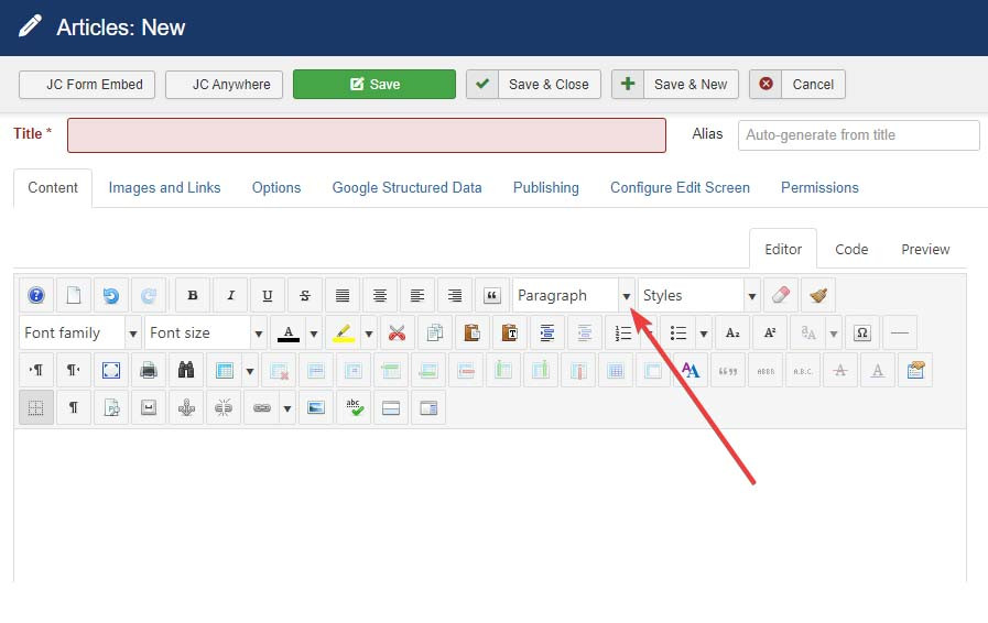 If you are using the Joomla Content Editor (JCE), which is the default editor we set up on all of the sites that we build, then adding headers is as easy as clicking the Format dropdown (shown in the screenshot below). By default, this dropdown is set to Paragraph, which is the style for the standard body text of your website. You can choose different Heading styles from the list.