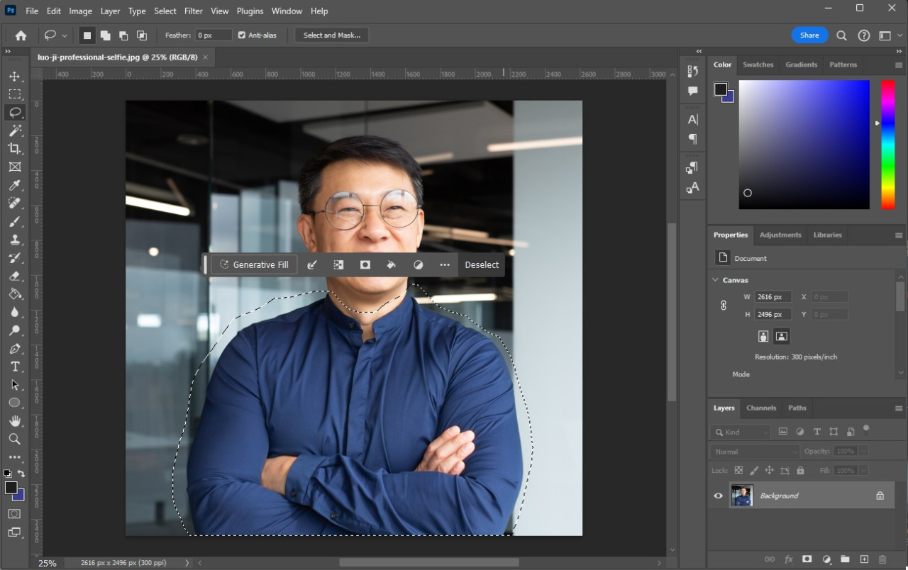 Let’s say you took staff photos, but one particular board member was a little more casual than everyone else, and you want the photos to match on your website. As long as you are working with a nice, high quality image, Adobe’s Generative AI feature can let you do some pretty amazing things.